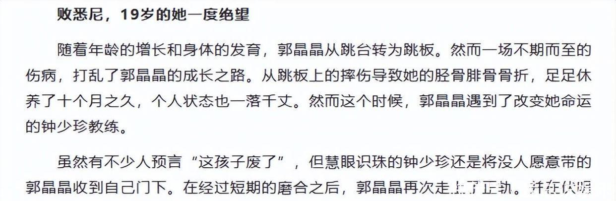 刚到悉尼一段时间,郭晶晶在一次训练中又不小心受伤了。正处于上升阶段的她不得不休养了整整十个月。这就意味着,她不仅没法正常训练,接下来还有比赛都别想参与。养伤期间,那个十五六岁的姑娘,不光身高蹿了20公分,体重也增加了五六斤。