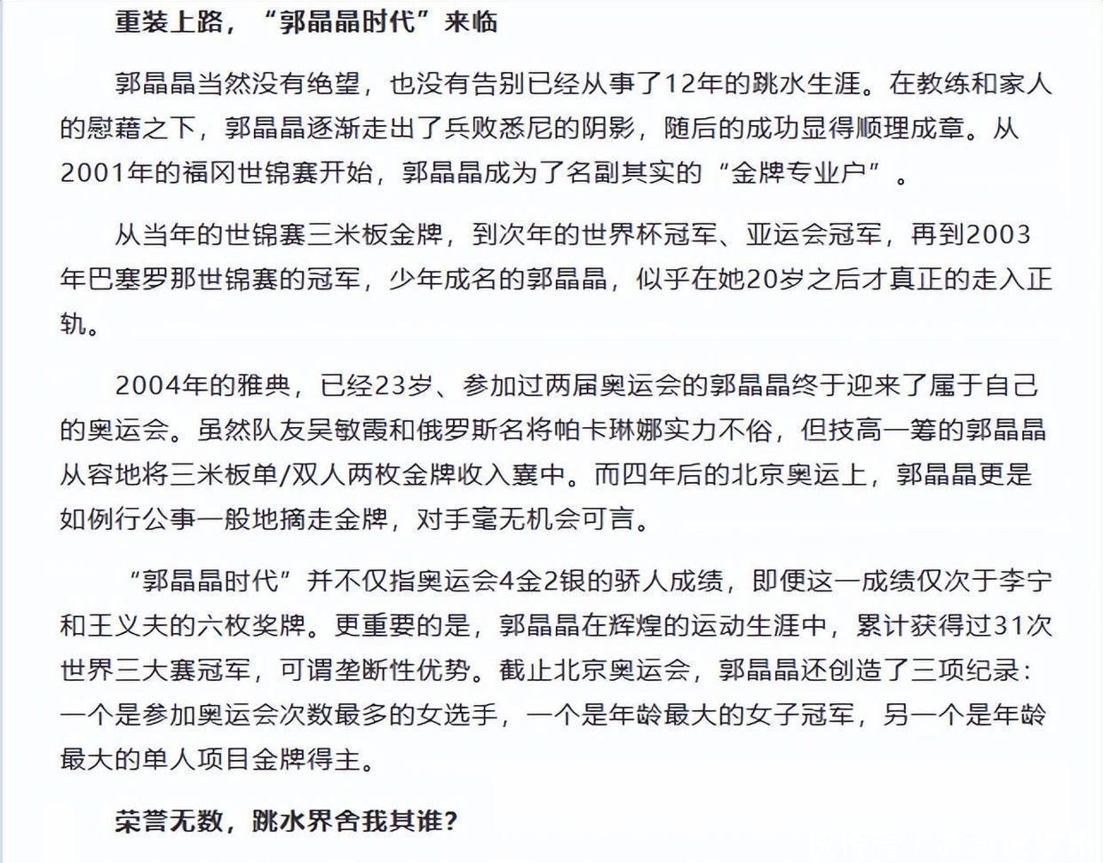 虽然如此,她依然坚持不懈,在1997年的全运会比赛中,拿到女子三米板的亚军。这让郭晶晶对未来的职业道路以及从跳台转向跳板这事儿充满了信心。